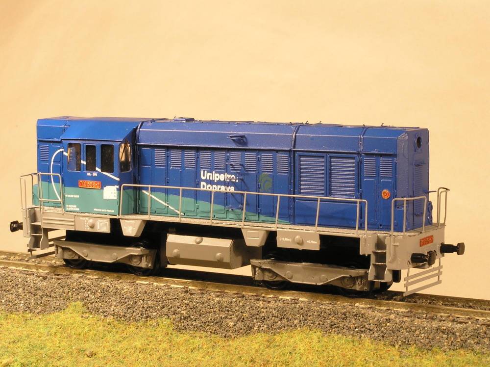 Maketa dieselové lokomotivy řady 740 558-2 ,,Unipetrol". Balení obsahuje ( karoserii s rámem v barvě, jako na obrázku i s popisy, masky podvozku, nádrž, nárazníky a drobné doplňky). Neobsahuje (motor, převody, podvozky, osvětlení, kola).