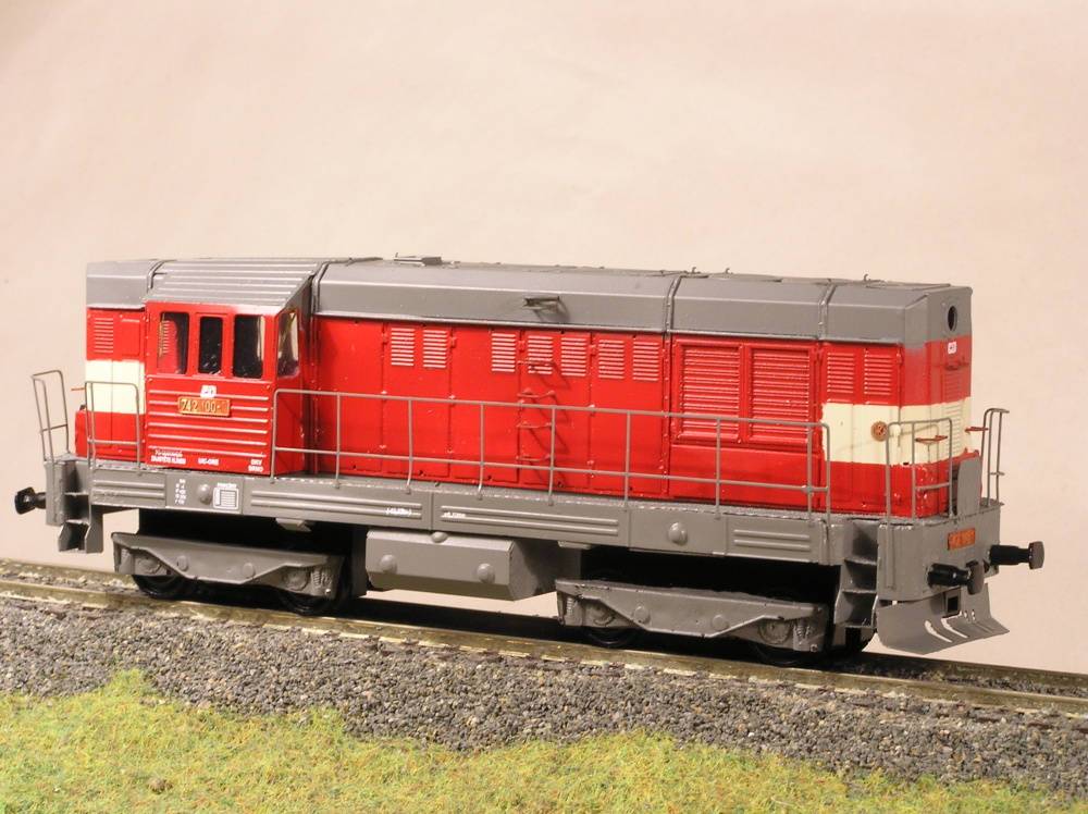 Maketa dieselové lokomotivy řady 742 100-1 drah ČD, Balení obsahuje ( karoserii s rámem v barvě, jako na obrázku i s popisy, masky podvozku, nádrž, nárazníky a drobné doplňky). Neobsahuje (motor, převody, podvozky, osvětlení, kola).