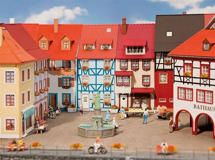 Stavebnice dvou modelů městských domů. V jednom z domů je umístěno pekařství. Rozměr 1: 103 x 62 x 142 mm Rozměr 2: 110 x 62 x 152 mm