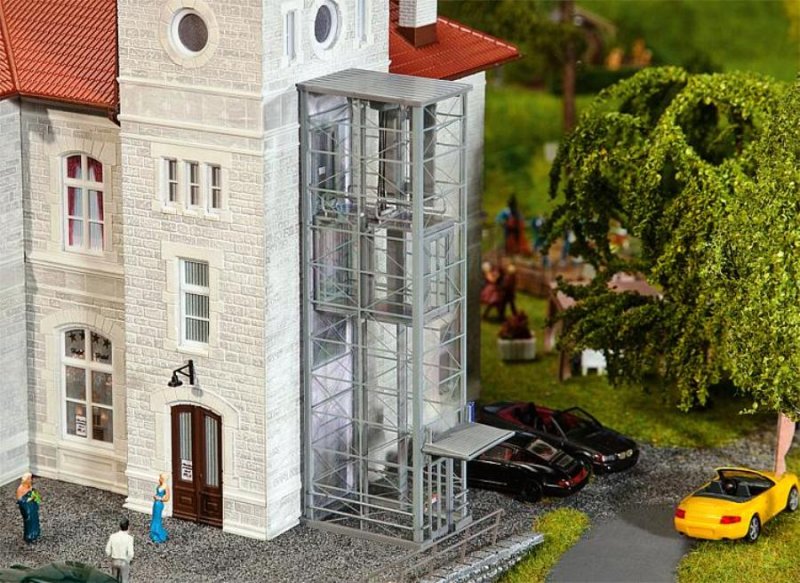 Stavebnice dvou ocelovoskleněných výtahů v různých výškách. Vysoký pro použití jako venkovní výtah k budově, nízký výtah jako přístup z podzemních parkovištích nebo na nástupištích.