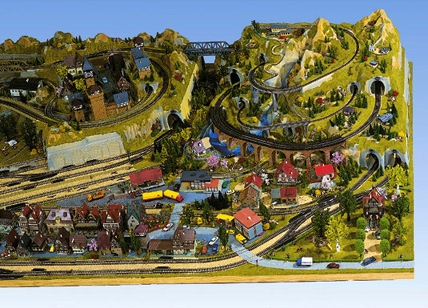 Montovaný díl pravý "Kolejiště"-Schattenbahnhof,který obsahuje kopce,skály,tunely, jezera, potoky a má naznačeny jízdní dráhy pro kolejivo. Krajinka je zatravněná a ručně malovaná. Rozměry:120 x 40 cm.