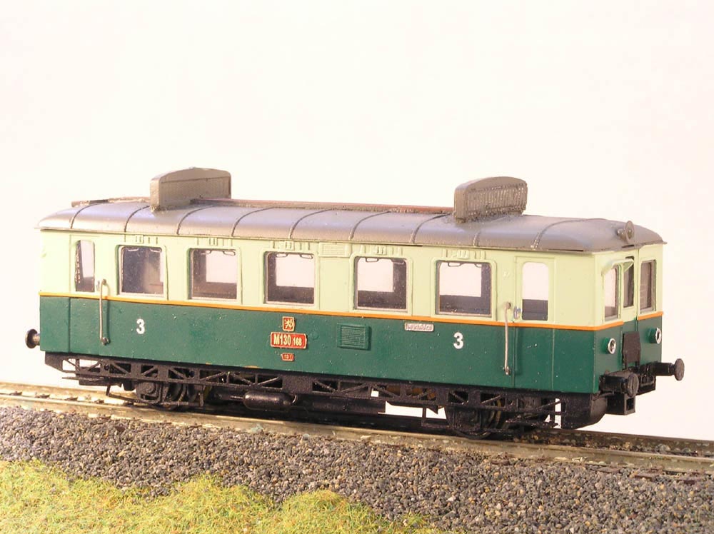 Maketa motorového vozu M130.168. Jedná se o maketu bez motoru. Barva: tmavě/světle zelená