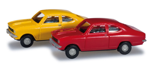 Sada obsahuje 2 ks Opel Kadett B Coupé, červená/žlutá.