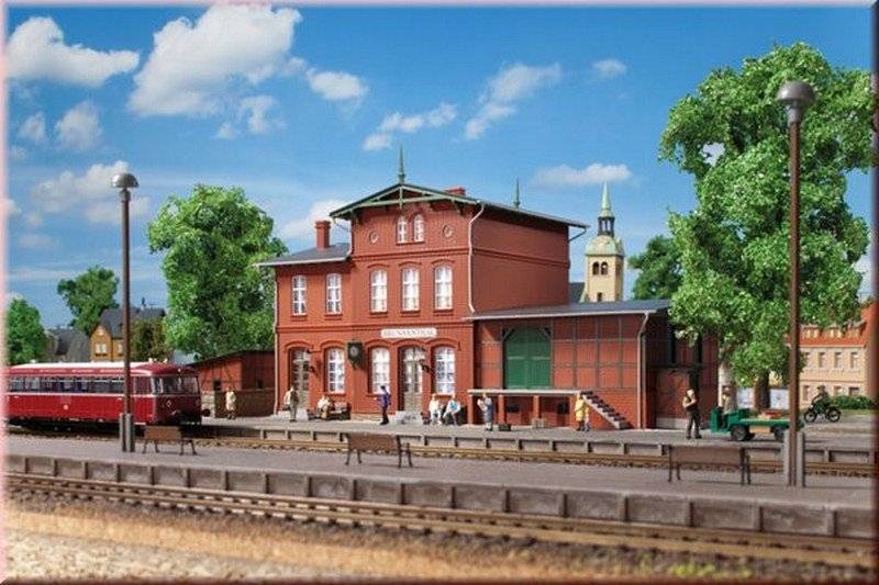 Malá nádražní budova se skladištěm. Vstup do sklepa lze vytvořit dvěma způsoby. Příslušenství, jako lampy a hodiny, odpovídají epoše I. Bez nástupiště. U kolejí s kolejovým ložem je nutné upravit výšku podložením. V prodeji od 02/2012 Stavebnice