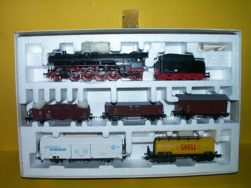 Nákladní set, skládající se z parní lokomotivy řady BR 41 a nákaldní vozy jak je vidět na fotografii, lokomotiva má pohon v tendru a je čelně osvětlena, celý set se nalézá v originální krabici. stav: nepoužité