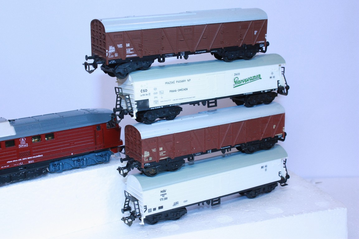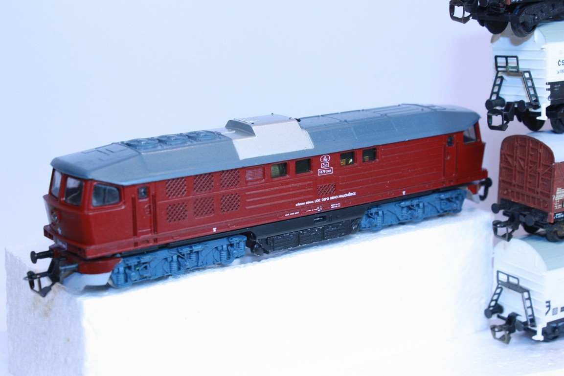 Lokomotiva T679 2002 ČSD má naháněny 4 nápravy, je osvětlena dle jízdy, bez přípravy na DCC, spřáhla lze vyměnit, vozy jsou drah ČSD, Máv, a DR.