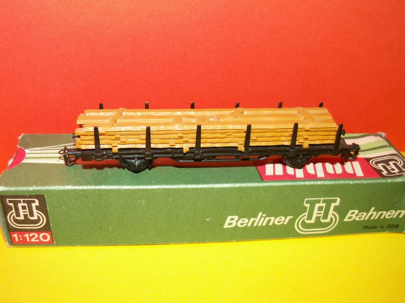 Plošinový 2 osý nákladní vůz s nákladem tzv. desek drah DR, vůz nemá krabičku, náklad lze sundat. Výrobce:Berliner TT Bahen Případné stav:nové