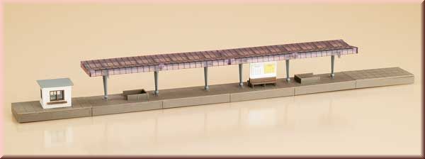Nástupiště se skleněnou střechou. Vzdálenost os kolejí 55 mm. Rozměry: 360x30x40mm