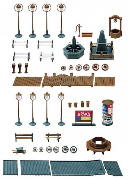 Sada doplňků vhodná pro dekoraci návsi nebo menšího náměstí jako např. lavičky, osvětlení, billboard, různé fontány, pomník, požární hydranty, vrata s bočními panely a mnoho dalšího.
