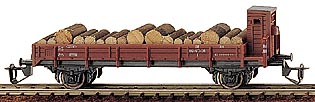 Nízkostěnný dvouosí vůz s brzdařskou budkou a nákladem dřeva X drah DR. Délka:91mm, kinematické krátké spřáhlo.
