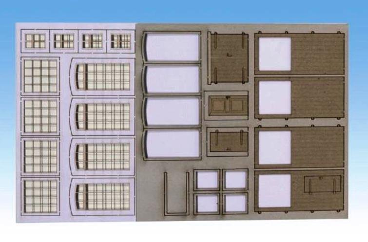 Sada laserem řezaných oken a dveří obsahuje: 2 velké stodolové dveře, garážová vrata, 2 dveře, 4 okna, 4 průmyslová okna a okenní fólie. Novinka 2012 ! (Dostupné říjen 2012)
