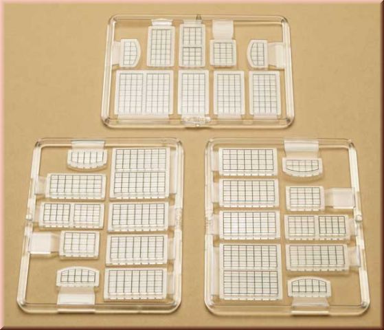 Set obsahuje menší okna s kulatými oblouky a 15 dalších oken o rozměrech 22x11 mm.