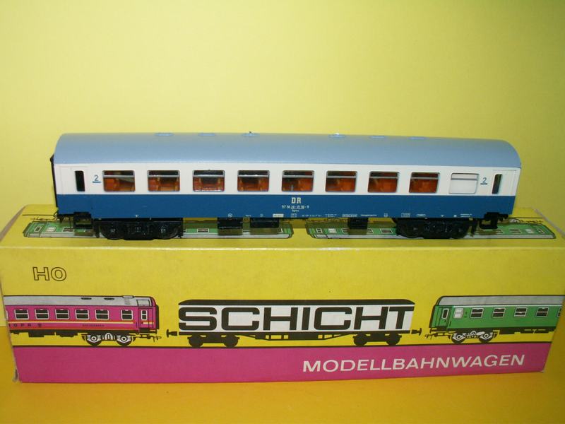 Rychlíkový vůz ve zkrácené verzi reko, modrobílé barvy drah DR.