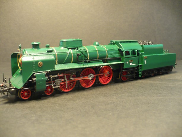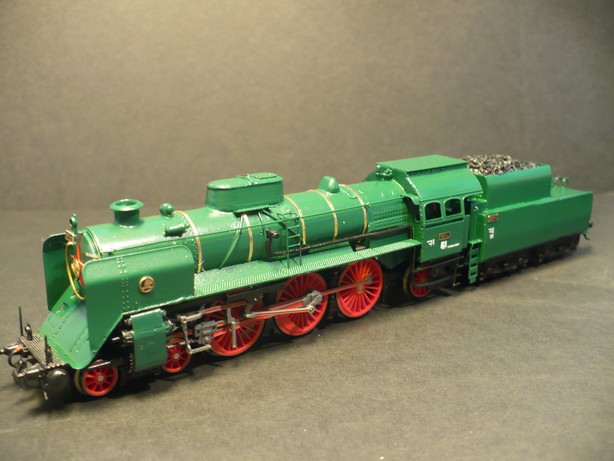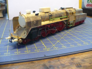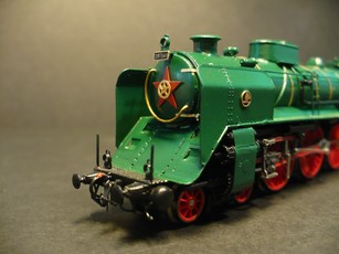 Model parní lokomotivy 387 ČSD, lokomotiva je posazena na pojezdu parní lokomotivy BR 01 fa Tillig, karoserie je složena z leptaného plechu, model je osvětlen s přepínáním dle jízdy. V detaily fotografie není model ještě vybaven osvětlením, při dodání samozřejmě bude model osvětlen.