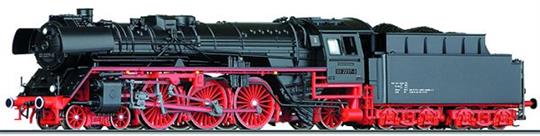 Parní lokomotiva BR 03 s přídavnýmnaloženým vozíkem.