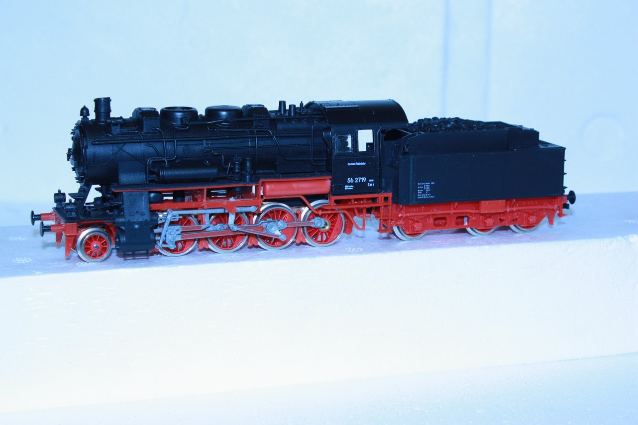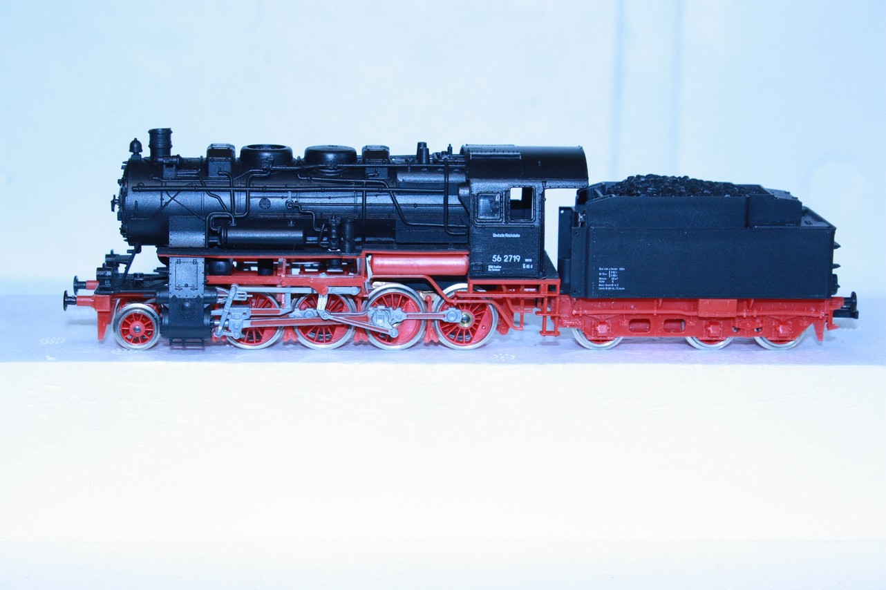 Parní lokomotiva řady BR 56/437ČSD drah německých a to černé barvy, pohon je v tendru lokomotivy, osvětlena je na čele.