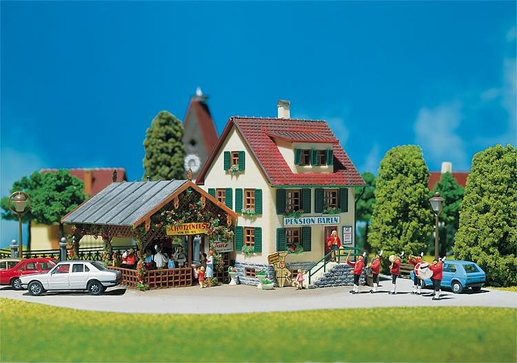 Stavebnice budovy pensionu s přístřeškem a podiem např. pro kapelu a stoly s židlemi. Rozměr: 145 x 145 x 96 mm