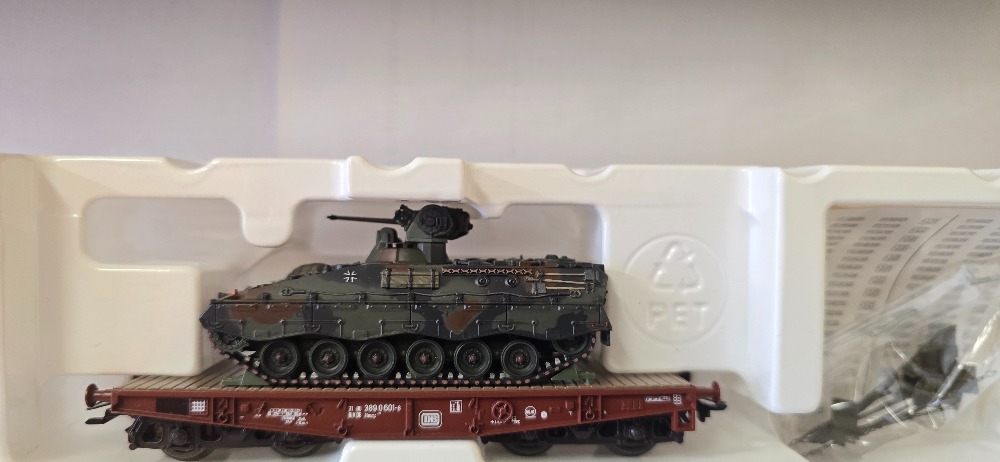 Plošinový vagón s nákladem bojové technicky doplňky přiloženy Roco (HO)