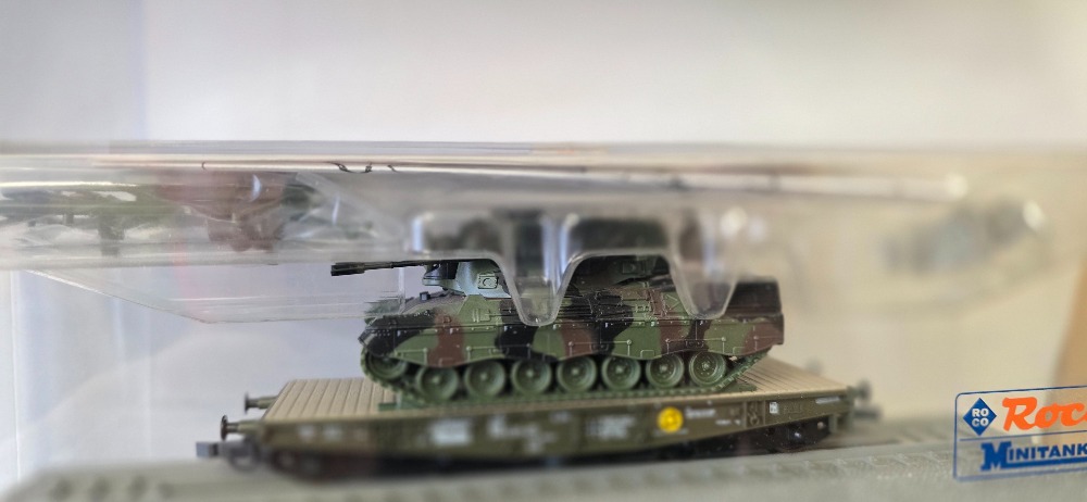 Plošinový vagón s nákladem bojové technicky doplňky přiloženy Roco (HO) originál obal