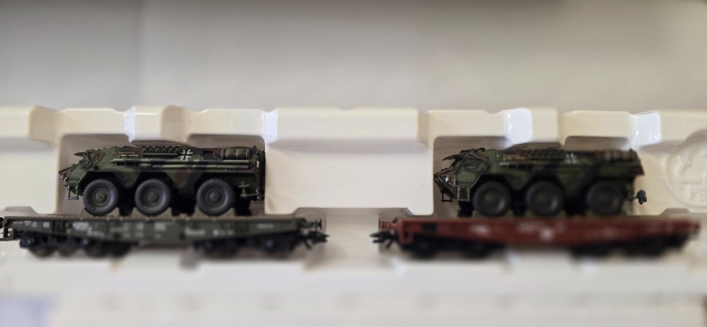 Plošinový vagón s nákladem bojové technicky doplňky přiloženy Roco (HO) originál obal