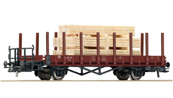 Plošinový vagon s nákladem - krátké dřevěné trámy.