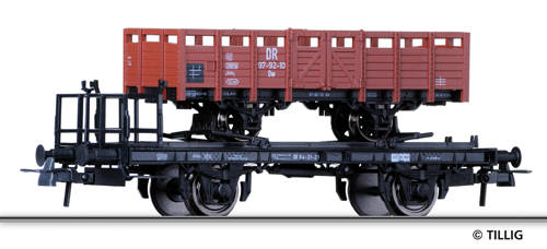 Plošinový vůz ložený úzkorozchodným. vozem drah DR.