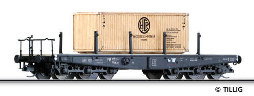 Plošinový vůz PPPzk 303 s nákladem bedny drah PKP.