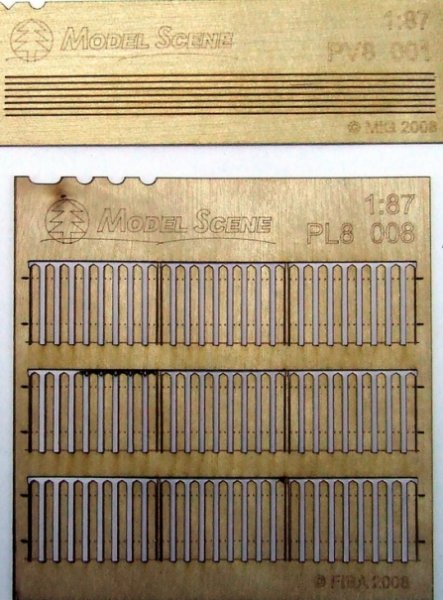 Dřevěné ploty jsou laserem vypalované z dřevěné dýhy. Balení obsahuje i dřevěné vazníky.