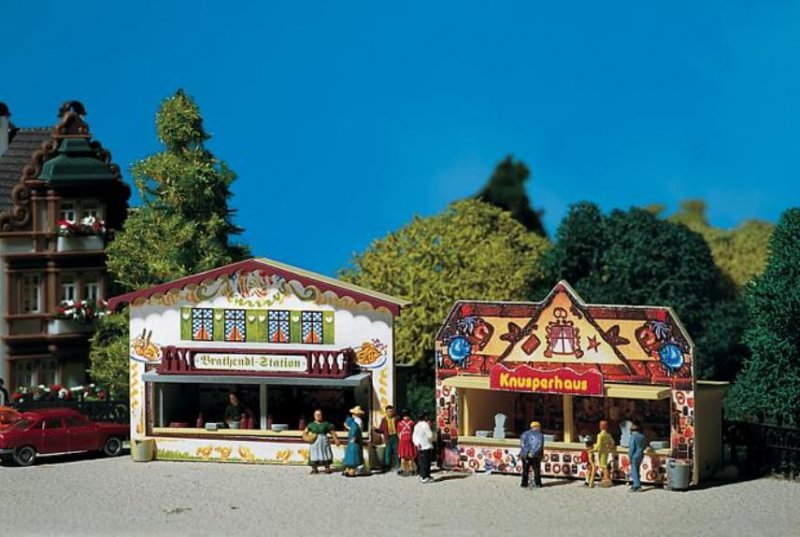 Stavebnice dvou pouťových stánků s bohatou dekorací a výzdobou. Rozměr: 53 x 18 x 38 mm (2 x)