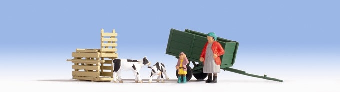 Přepravník, vozík + 2 telata + 2 postavičky