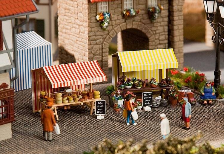 Stavebnice modelu dvou prodejních stánků - se sýry a s květinami. Balení obsahuje spoustu dekoračních doplňků. Rozměr: 35 x 31 x 32 mm