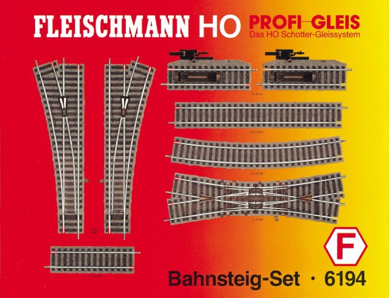 Profi kolej set Set F - "Nástupiště" Sada obsahuje: 11 rovných kolejí (10 x 6101, 1 x 6103), 2 rozpojovací koleje 6114, 2 zatáčky 6138, 1 levou výhybku 6170, 1 pravou výhybku 6171, 1 dvojitou výhybku 6164