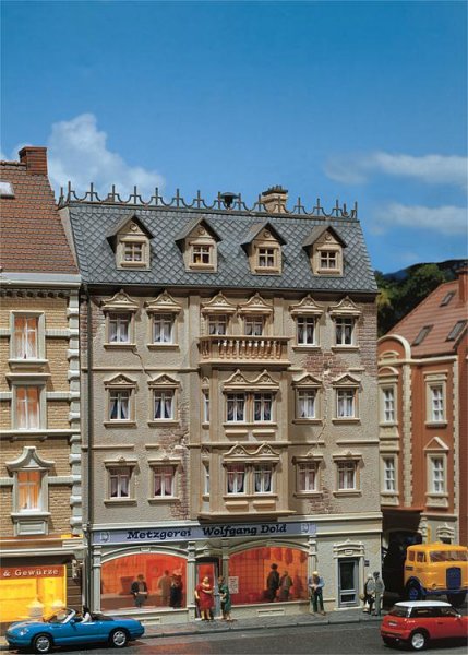 Stavebnice modelu městského domu s řeznictvím. Řeznictví s kompletním vnitřním vybavením. Rozměr: 145 x 126 x 201 mm
