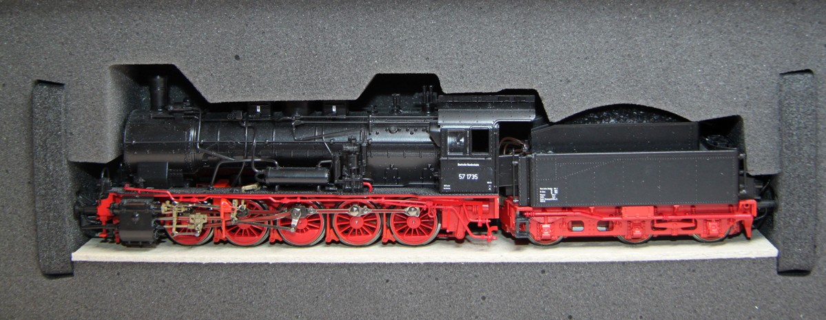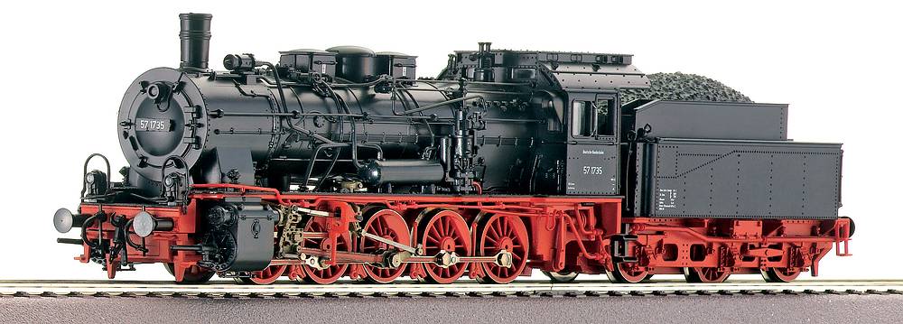 Parní lokomotiva BR 57 drah DB. Model osvětlen s přepínáním dle jízdy. U německých drah byly lokomotivy řady BR 57 často nasazovány do těžkého posunu a k nákladním vlakům na krátké vzdálenosti. Model má nově vytvořený přední nosič nárazníku se spřáhlem, digitálním rozhraním a přepracovaným pohonem s výkyvně uloženými osami tendru kvůli zlepšení hladkého běhu a snížení spotřeby.