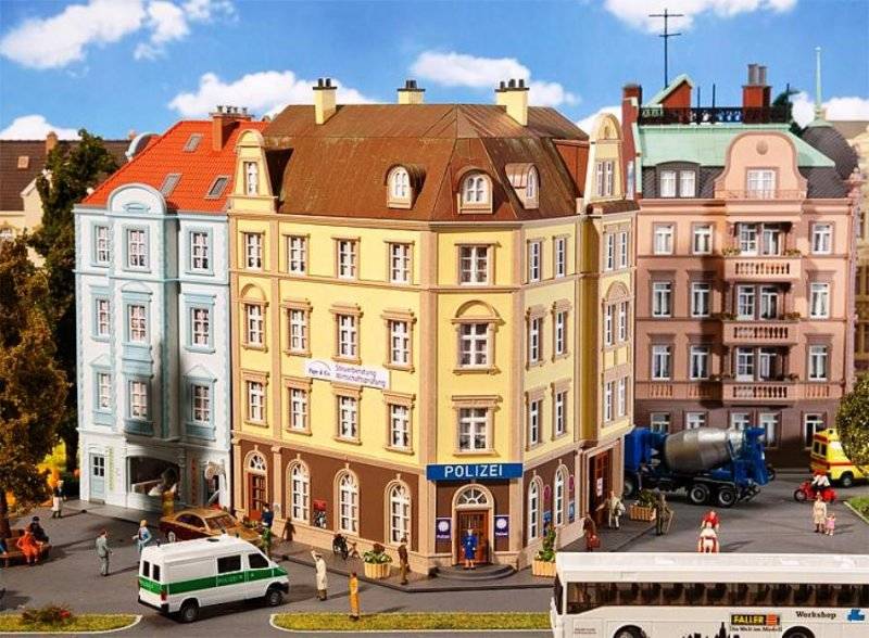 Stavebnice rohové budovy s městskou policií v přízemí. Rozměr: 250 x 205 x 225 mm