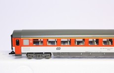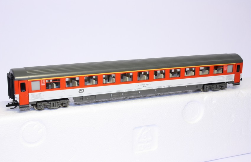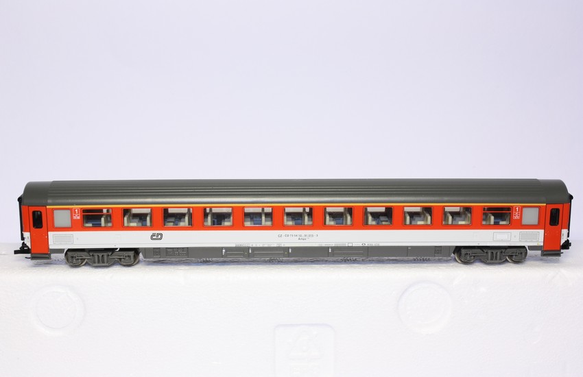 Rychlíkový vůz Eurofirma 1.tř. tpy Ampz drah ČD, z nové konstrukce f. Tillig. Model je vnitřně vybaven, příprava na osvětlení, šachta dle NEM 358. Délka:220 mm.