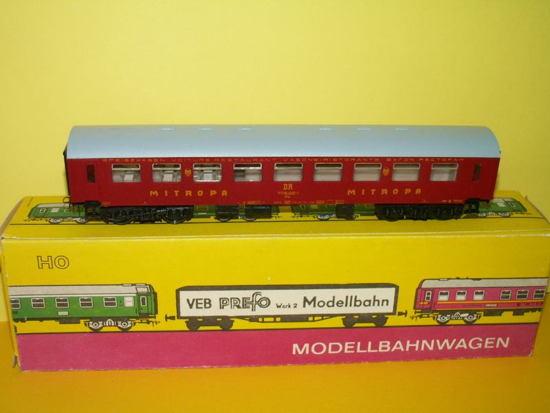 Rychlíkový vůz červené barvy ve zkrácené verzi reko pod názvem ,,Mitropa" drah německých.