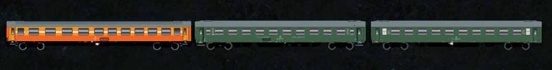 Barva vagonů : 2x zelená s šedou střechou, 1x okrovooranžová s šedou střechou