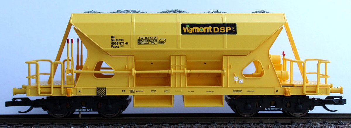žlutý, s nákladem, nové podvozky s ložisky PEHO. Logo Viamont DSP. KKK číslo vozu 84 54 6999 971-6