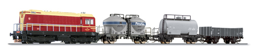 Set Leuna s loko. V75+3 nákladní vozy. Modely opatřeny šachtou NEM, příprava na digitál osvětlení přepíná dle jízdy.