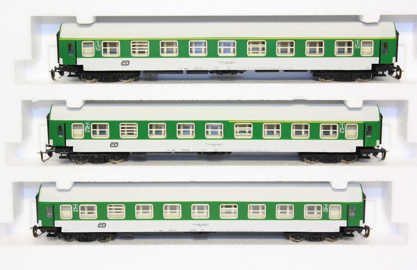 Set rychlíkových vozů drah ČD typ Y. Vozy mají náhradní obal neposkozeny
