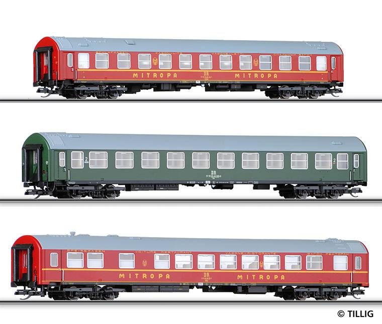 Set rychlíkových vozů (spací vůz, jidelní vůz a vůz 2. třídy) drah DR.