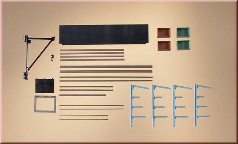 Otočný nástěnný jeřáb v litinovém provedení, konzolové regály se surovým materiálem pro venkovní skladování chráněné proti povětrnostním vlivům, sklápěcí dveře do sklepa a přepravky.