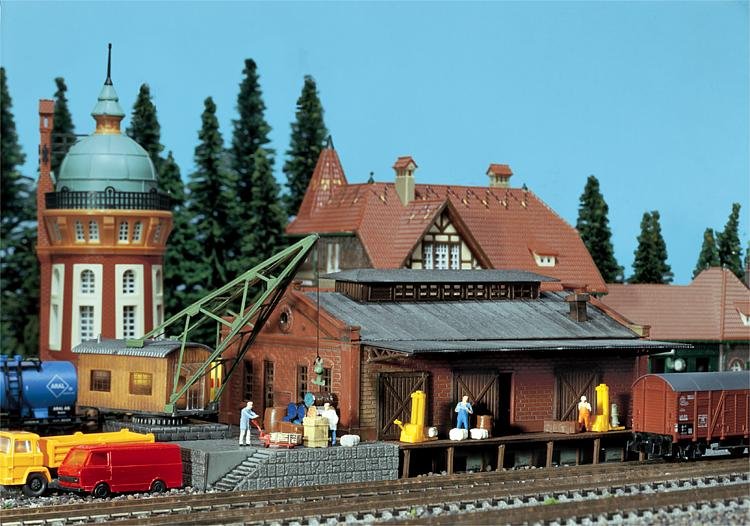 Stavebnice modelu skladiště s oboustranou rampou a nákladním jeřábem.