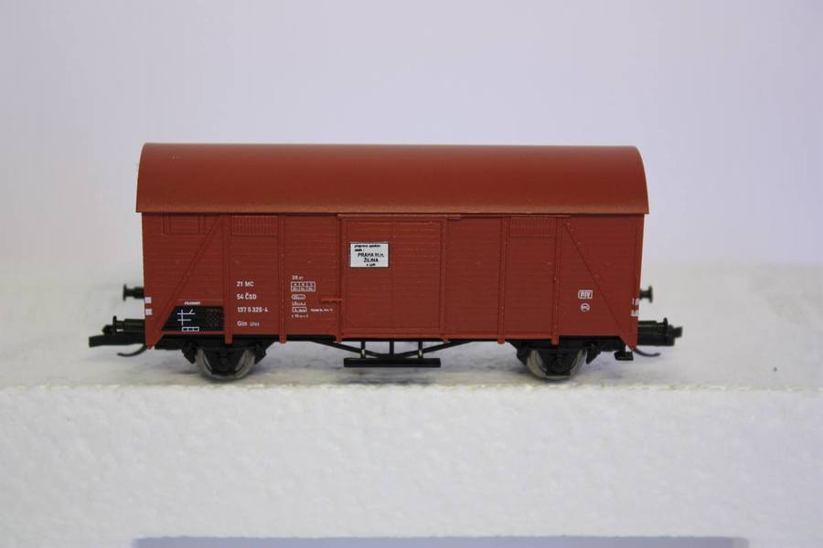 Spěšninový vůz řady Ztr hnědé barvy trasa Praha-Žilina drah ČSD