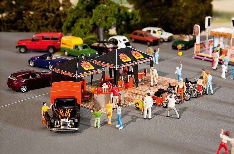 Stánky s interiérem a příslušenstvím jako je např. 6 motocyklů, Chevrolet Pick Up s potiskem a další.