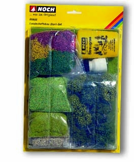 Základní sada se vším, co potřebujete ke tvorbě krajinky: tmel na vytváření skal, posypová tráva s posypovou stříkací dózou, lepidlo na lepení trávy, travní minikoberec, posypový materiál, dekorační mech, 6 jedlí a 4 listnaté stromky.