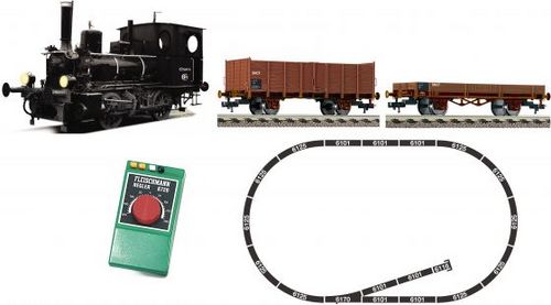 Start set s loko.+vozy+koleje drah SNCF. Set obsahuje: 1 x parní lokomotiva SNCF, 2 x nákladní vůz, napájecí regulovatelný transformátor, Fleischmann Profi-gleis (7 x 6101, 10 x 6125, 1 kolej s napájecím kabelem, 1 x výhybka 6170 a koncový blok 6116) Délka Vlaku: 310 mm Rozměr oválu: 148 cm x 88 cm