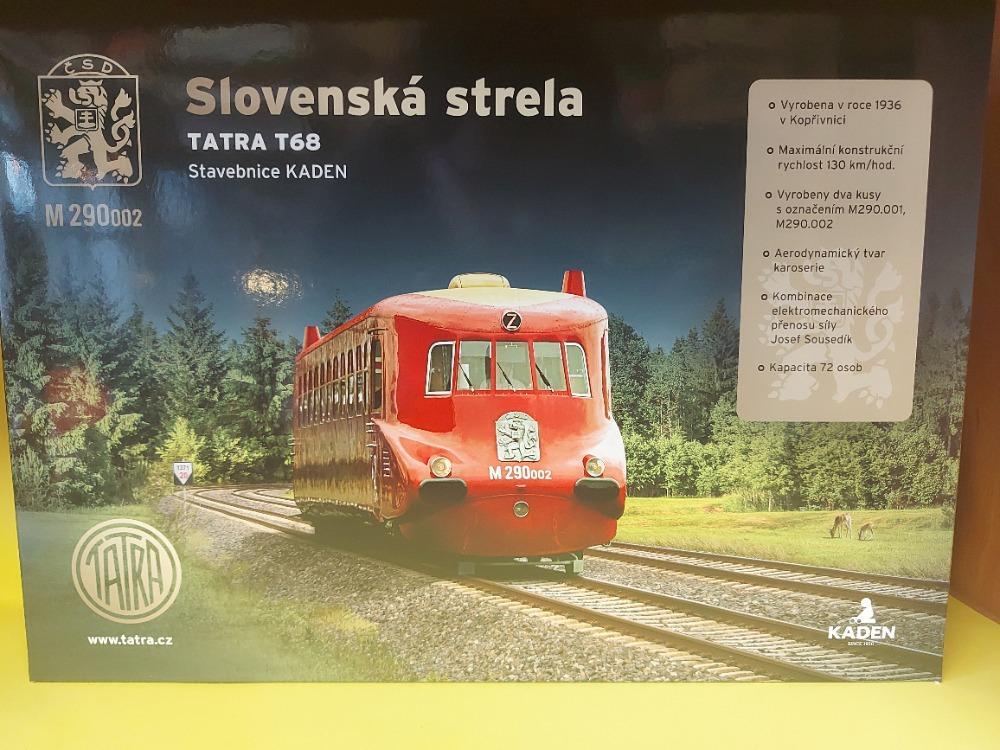 stavebnice legendárního vlaku TATRA T68 Slovenská Strela v měřítku H0 (1:87) sestávající se ze 60ti dílů. Karoserie lisovaná z probarveného červeného plastu. Stavebnice obsahuje návod k sestavení a sadu obtisků. Lepidlo ani barvy nejsou součástí stavebnice. Velikost výsledného modelu je 300 x 46 x 38 mm.