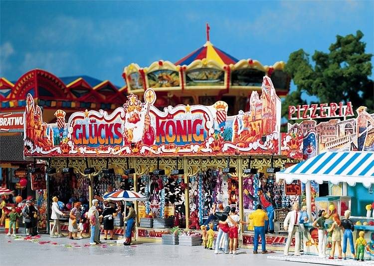Stavebnice modelu pouťové střelnice s mnoha dekoračnícmi prvky a příslušenstvím. Rozměr: 253 x 55 x 75 mm